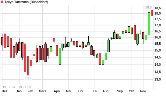 Mit dem Anstieg auf 17,60 EUR hat die Tokyo Tatemono-Aktie (ISIN JP3582600007) am 18.11.2025 ein neues 10-Jahres-Hoch erreicht und damit den Kurs vom 06.10.2025 eingestellt.