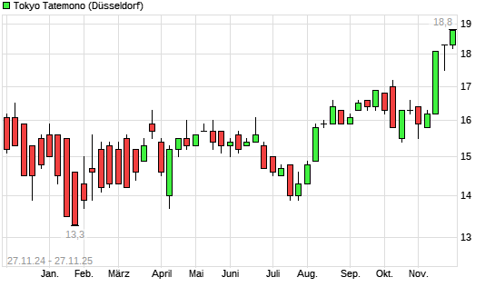 Mit dem Anstieg auf 18,80 EUR hat die Tokyo Tatemono-Aktie (ISIN JP3582600007) am 26.11.2025 ein neues 10-Jahres-Hoch erreicht und damit den Kurs vom 25.11.2025 eingestellt.