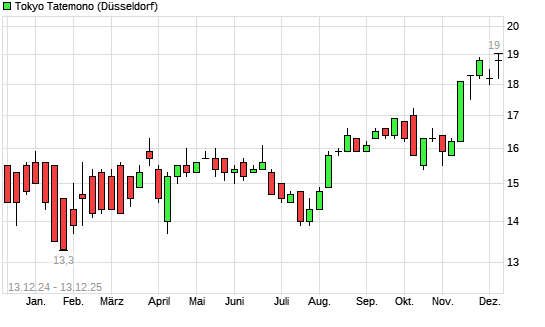 Mit dem Anstieg auf 19,00 EUR hat die Tokyo Tatemono-Aktie (ISIN JP3582600007) am 12.12.2025 ein neues 10-Jahres-Hoch erreicht und damit den Kurs vom 27.11.2025 eingestellt.