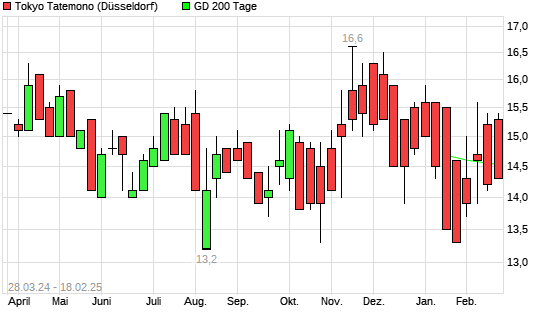 Mit dem Anstieg auf 14,70 EUR hat die Tokyo Tatemono-Aktie am 17.02.2025 die 200-Tage-Linie nach oben gekreuzt.