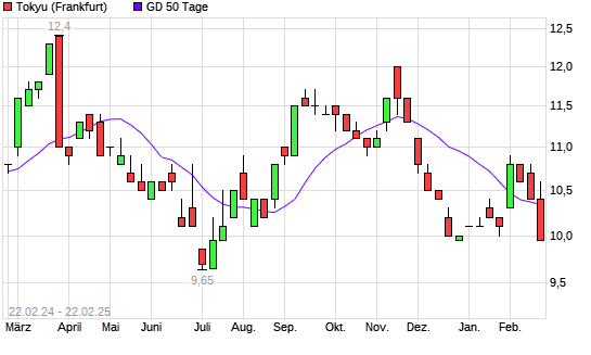 Mit dem Rücksetzer auf 9,95 EUR hat die Tokyu-Aktie am 21.02.2025 die 50-Tage-Linie nach unten gekreuzt.