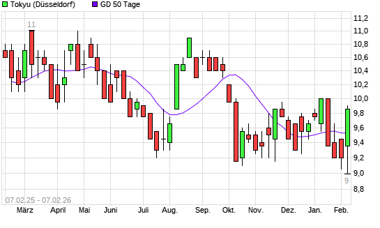 Mit dem Anstieg auf 9,60 EUR hat die Tokyu-Aktie am 06.02.2026 die 50-Tage-Linie nach oben gekreuzt.Die Tokyu-Aktie befindet sich seit dem 30.09.2025 im langfristigen Abwärtstrend und hat in ...weiterlesen