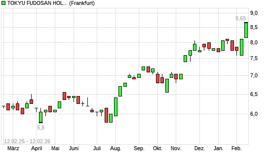 Mit dem Anstieg auf 8,50 EUR hat die Tokyu Fudosan Holdings-Aktie (ISIN JP3569200003) am 11.02.2026 ein neues All-Time-High erreicht und damit den Kurs vom 10.02.2026 eingestellt.
