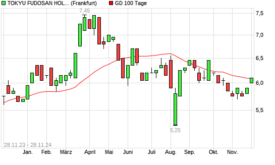 Mit dem Rücksetzer auf 6,05 EUR hat die Tokyu Fudosan Holdings-Aktie am 27.11.2024 die 100-Tage-Linie nach unten gekreuzt.