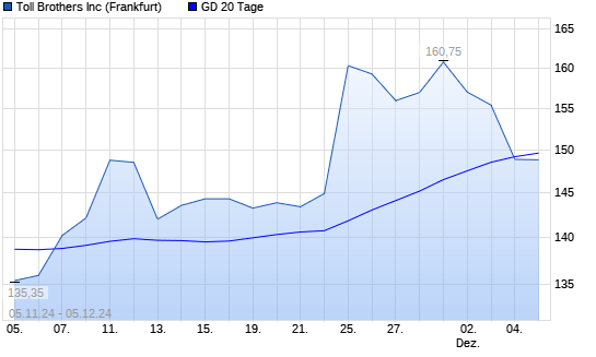 Mit dem Rücksetzer auf 148,90 EUR hat die Toll Brothers-Aktie am 04.12.2024 die 20-Tage-Linie nach unten gekreuzt.