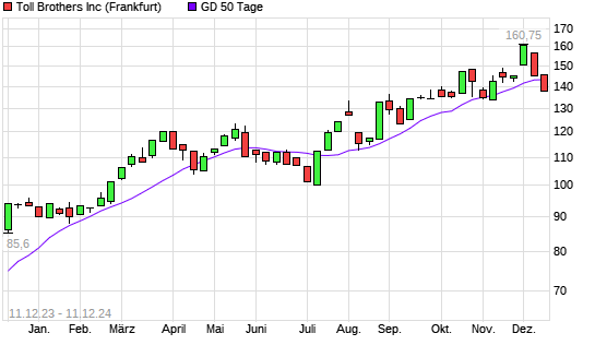 Mit dem Rücksetzer auf 140,70 EUR hat die Toll Brothers-Aktie am 10.12.2024 die 50-Tage-Linie nach unten gekreuzt.