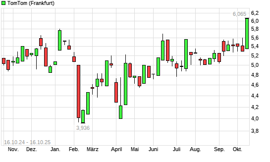 Mit dem Anstieg auf 6,06 EUR hat die TomTom-Aktie (ISIN NL0013332471) am 15.10.2025 ein neues 12-Monats-Hoch erreicht und damit den Kurs vom 07.01.2025 eingestellt.