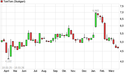 Mit dem Rücksetzer auf 4,53 EUR hat die TomTom-Aktie (ISIN NL0013332471) am 17.03.2026 ein neues 6-Monats-Tief erreicht und damit den Kurs vom 13.03.2026 eingestellt.