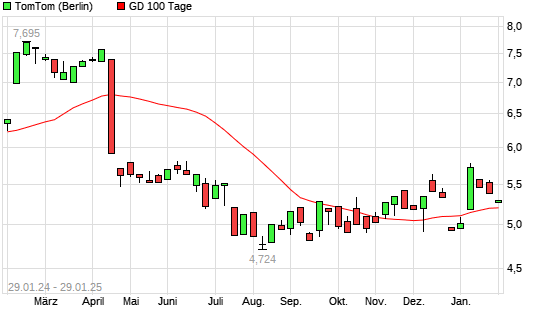 Mit dem Anstieg auf 5,24 EUR hat die TomTom-Aktie am 28.01.2025 die 100-Tage-Linie nach oben gekreuzt.
