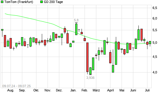 Mit dem Anstieg auf 5,06 EUR hat die TomTom-Aktie am 08.07.2025 die 200-Tage-Linie nach oben gekreuzt.