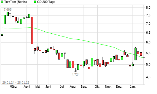 Mit dem Rücksetzer auf 5,18 EUR hat die TomTom-Aktie am 27.01.2025 die 200-Tage-Linie nach unten gekreuzt.