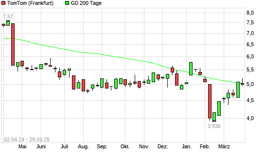 Mit dem Rücksetzer auf 5,00 EUR hat die TomTom-Aktie am 28.03.2025 die 200-Tage-Linie nach unten gekreuzt.