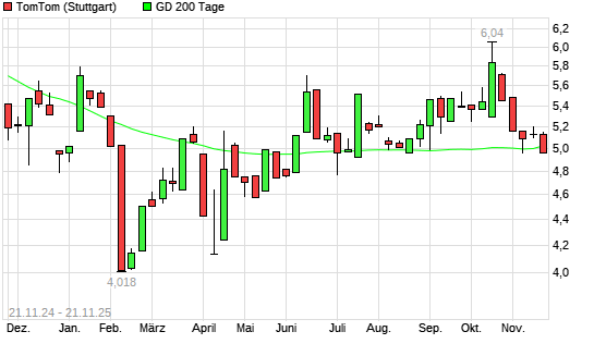Mit dem Rücksetzer auf 5,01 EUR hat die TomTom-Aktie am 20.11.2025 die 200-Tage-Linie nach unten gekreuzt.
