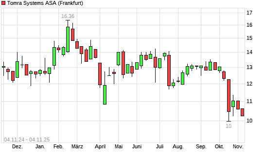 Mit dem Rücksetzer auf 10,32 EUR hat die Tomra Systems-Aktie (ISIN NO0012470089) am 03.11.2025 ein neues 12-Monats-Tief erreicht und damit den Kurs vom 17.10.2025 eingestellt.