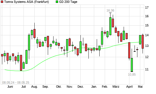 Mit dem Rücksetzer auf 12,86 EUR hat die Tomra Systems-Aktie am 07.05.2025 die 200-Tage-Linie nach unten gekreuzt.