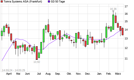 Mit dem Rücksetzer auf 13,50 EUR hat die Tomra Systems-Aktie am 13.03.2025 die 50-Tage-Linie nach unten gekreuzt.