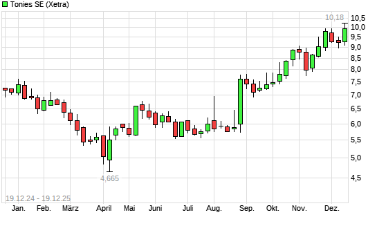 Mit dem Anstieg auf 9,75 EUR hat die Tonies-Aktie (ISIN LU2333563281) am 18.12.2025 ein neues 3-Jahres-Hoch erreicht und damit den Kurs vom 01.12.2025 eingestellt.