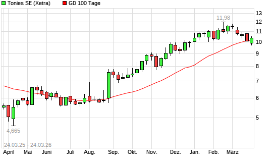 Mit dem Anstieg auf 10,44 EUR hat die Tonies-Aktie am 23.03.2026 die 100-Tage-Linie nach oben gekreuzt.