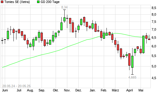 Mit dem Anstieg auf 6,57 EUR hat die Tonies-Aktie am 19.05.2025 die 200-Tage-Linie nach oben gekreuzt.
