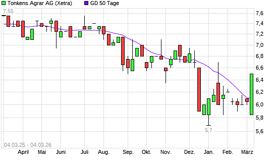 Mit dem Anstieg auf 6,15 EUR hat die Tonkens Agrar-Aktie am 03.03.2026 die 50-Tage-Linie nach oben gekreuzt.