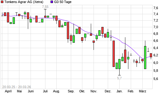 Mit dem Rücksetzer auf 6,00 EUR hat die Tonkens Agrar-Aktie am 19.03.2026 die 50-Tage-Linie nach unten gekreuzt.