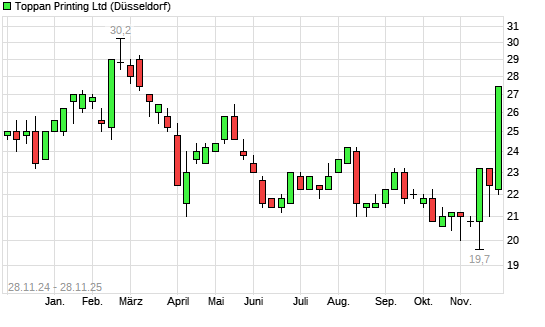 Mit dem Anstieg auf 27,00 EUR hat die Toppan Printing-Aktie (ISIN JP3629000005) am 27.11.2025 ein neues 6-Monats-Hoch erreicht und damit den Kurs vom 26.11.2025 eingestellt.