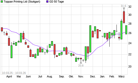Mit dem Rücksetzer auf 26,00 EUR hat die Toppan Printing-Aktie am 09.03.2026 die 50-Tage-Linie nach unten gekreuzt.