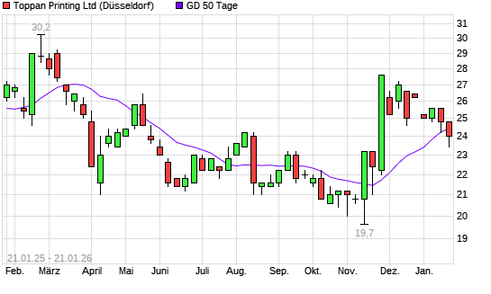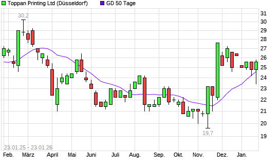 Mit dem Anstieg auf 25,80 EUR hat die Toppan Printing-Aktie am 22.01.2026 die 50-Tage-Linie nach oben gekreuzt.Die Toppan Printing-Aktie befindet sich seit dem 25.11.2025 im langfristigen Aufwärtstrend ...weiterlesen