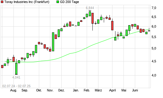 Mit dem Rücksetzer auf 5,76 EUR hat die Toray Industries-Aktie am 01.07.2025 die 200-Tage-Linie nach unten gekreuzt.