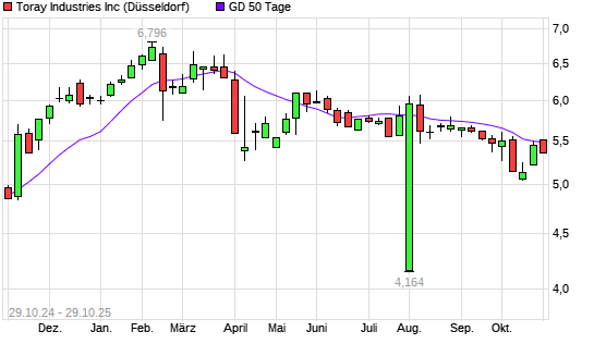 Mit dem Rücksetzer auf 5,42 EUR hat die Toray Industries-Aktie am 28.10.2025 die 50-Tage-Linie nach unten gekreuzt.