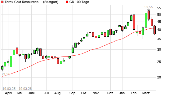 Mit dem Rücksetzer auf 40,84 EUR hat die Torex Gold Resources-Aktie am 18.03.2026 die 100-Tage-Linie nach unten gekreuzt.