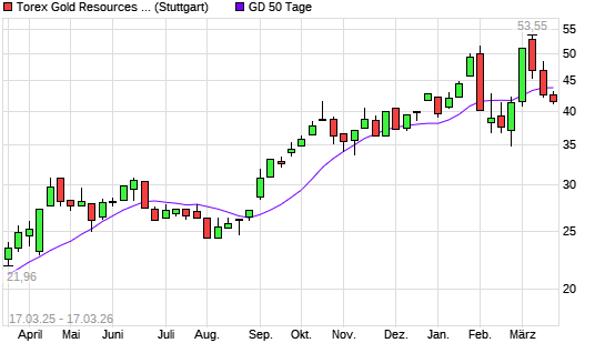 Mit dem Rücksetzer auf 42,28 EUR hat die Torex Gold Resources-Aktie am 16.03.2026 die 50-Tage-Linie nach unten gekreuzt.