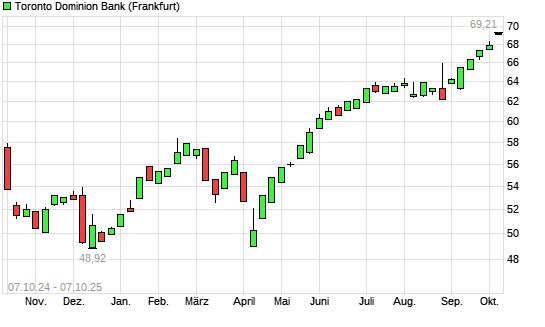 Mit dem Anstieg auf 69,10 EUR hat die Toronto-Dominion Bank-Aktie (ISIN CA8911605092) am 06.10.2025 ein neues 3-Jahres-Hoch erreicht und damit den Kurs vom 01.10.2025 eingestellt.