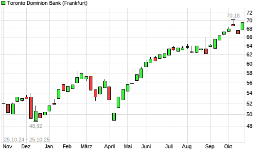 Mit dem Anstieg auf 69,58 EUR hat die Toronto-Dominion Bank-Aktie (ISIN CA8911605092) am 24.10.2025 ein neues 3-Jahres-Hoch erreicht und damit den Kurs vom 23.10.2025 eingestellt.