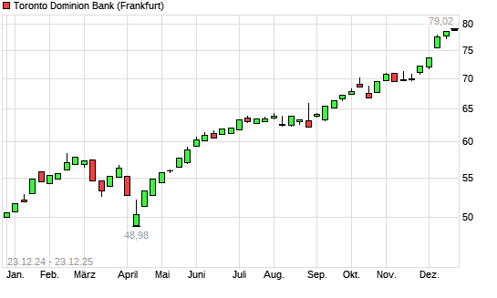 Mit dem Anstieg auf 79,02 EUR hat die Toronto-Dominion Bank-Aktie (ISIN CA8911605092) am 22.12.2025 ein neues All-Time-High erreicht und damit den Kurs vom 19.12.2025 eingestellt.