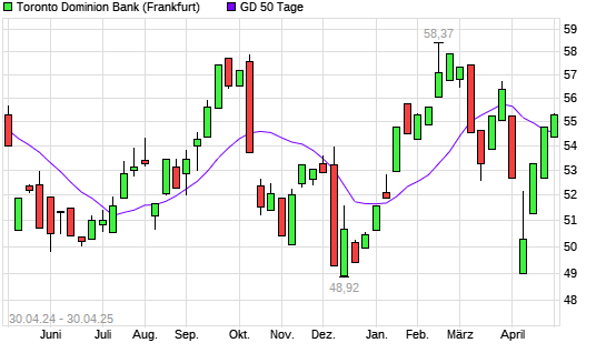 Mit dem Anstieg auf 55,35 EUR hat die Toronto-Dominion Bank-Aktie am 29.04.2025 die 50-Tage-Linie nach oben gekreuzt.Die Toronto-Dominion Bank-Aktie befindet sich seit dem 23.04.2025 im langfristigen ...weiterlesen
