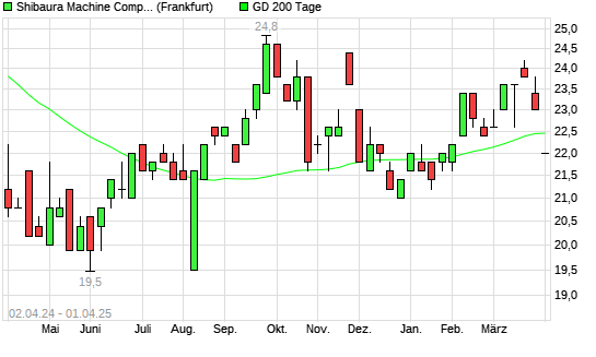 Mit dem Rücksetzer auf 22,00 EUR hat die Toshiba Machine-Aktie am 31.03.2025 die 200-Tage-Linie nach unten gekreuzt.