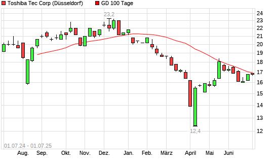 Mit dem Anstieg auf 17,80 EUR hat die Toshiba Tec-Aktie am 30.06.2025 die 100-Tage-Linie nach oben gekreuzt.