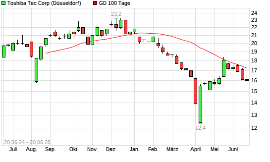 Mit dem Rücksetzer auf 16,60 EUR hat die Toshiba Tec-Aktie am 19.06.2025 die 100-Tage-Linie nach unten gekreuzt.