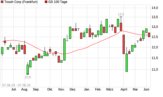 Mit dem Rücksetzer auf 12,50 EUR hat die Tosoh-Aktie am 06.06.2025 die 100-Tage-Linie nach unten gekreuzt.