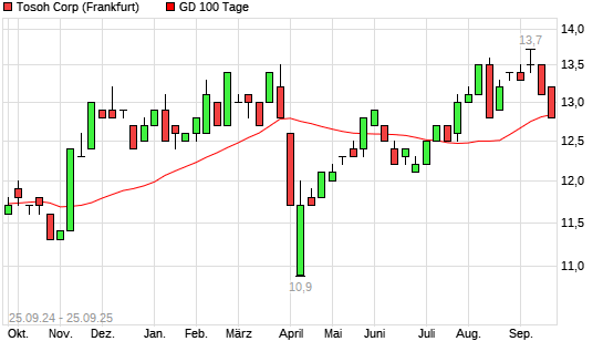 Mit dem Rücksetzer auf 12,80 EUR hat die Tosoh-Aktie am 24.09.2025 die 100-Tage-Linie nach unten gekreuzt.
