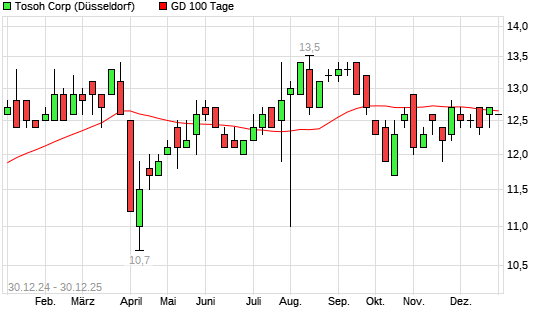 Mit dem Rücksetzer auf 12,70 EUR hat die Tosoh-Aktie am 29.12.2025 die 100-Tage-Linie nach unten gekreuzt.