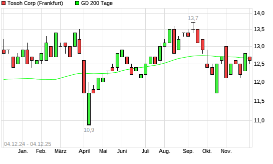 Mit dem Rücksetzer auf 12,50 EUR hat die Tosoh-Aktie am 03.12.2025 die 200-Tage-Linie nach unten gekreuzt.