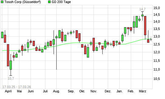 Mit dem Rücksetzer auf 12,80 EUR hat die Tosoh-Aktie am 16.03.2026 die 200-Tage-Linie nach unten gekreuzt.