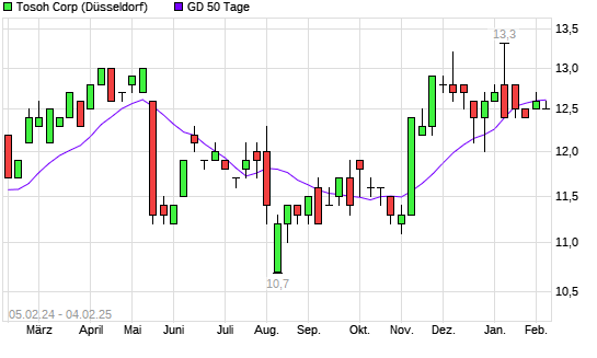 Mit dem Rücksetzer auf 12,60 EUR hat die Tosoh-Aktie am 03.02.2025 die 50-Tage-Linie nach unten gekreuzt.