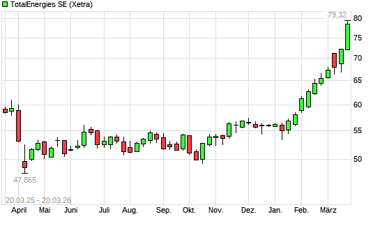 Mit dem Anstieg auf 77,62 EUR hat die Totalenergies (ex Total)-Aktie (ISIN FR0000120271) am 19.03.2026 ein neues All-Time-High erreicht und damit den Kurs vom 18.03.2026 eingestellt.