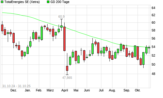 Mit dem Rücksetzer auf 53,75 EUR hat die Totalenergies (ex Total)-Aktie am 30.10.2025 die 200-Tage-Linie nach unten gekreuzt.Die Totalenergies (ex Total)-Aktie befand sich seit dem 29.10.2025 ...weiterlesen