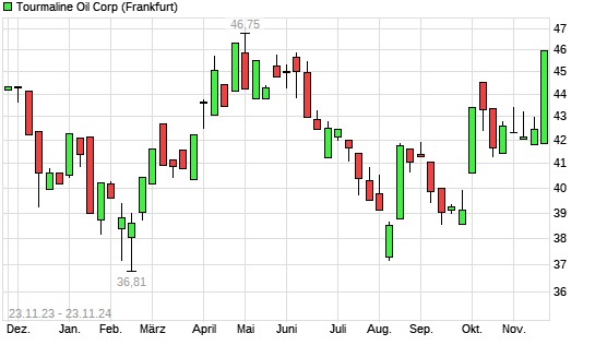Mit dem Anstieg auf 45,99 EUR hat die Tourmaline Oil-Aktie (ISIN CA89156V1067) am 22.11.2024 ein neues 6-Monats-Hoch erreicht und damit den Kurs vom 23.05.2024 eingestellt.