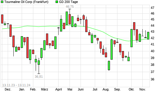 Mit dem Anstieg auf 42,97 EUR hat die Tourmaline Oil-Aktie am 12.11.2024 die 200-Tage-Linie nach oben gekreuzt.