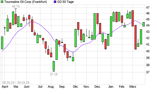 Mit dem Anstieg auf 44,48 EUR hat die Tourmaline Oil-Aktie am 25.03.2025 die 50-Tage-Linie nach oben gekreuzt.